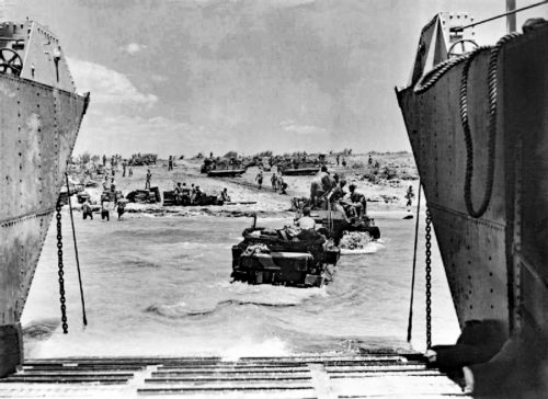Above: View coming off a Landing Craft on to the beach in Sicily. This is how Dad would have driven his Matador into the sea and into Sicily.