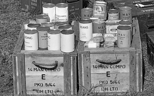 Records show that they had cooks from the Royal Catering Corps attached to the unit though at times they would have cooked up food themselves. The picture below gives an idea of what soldiers were eating during WW2, This would vary and may have been supplemented with whatever local produce was available.